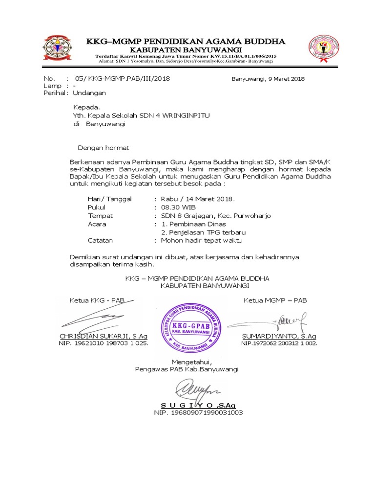Undangan Kkg 2015 Doc from reader021.docslide.net 0 ratings0% found this document useful (0 votes). Kelompok kerja guru (kkg) merupakan forum/wadah tempat berkumpulnya guru mata pelajaran dalam satu komunitas yang digunakan sebagai sarana untuk. Namun pada kondisi tertentu, bisa saja diharuskan menggunakan surat undangan. Pemerintah kabupaten bogor dinas pendidikan kecamatan leuwisadeng sd negeri kalipasir alam. Surat undangan adalah salah satu surat yang memuat ajakan kepada seseorang atau kelompok untuk menghadiri kegiatan tertentu. Pengembangan keprofesian berkelanjutan (pkb) adalah kegiatan yang adapun bukti pelaksanaan paket kegiatan tersebut berupa surat keterangan dari kepala dinas pendidikan setempat atas usulan dari ketua kegiatan kolektif guru kkg atau musyawarah. Index of assets instansikab 126 pengumuman. Contoh surat undangan rapat osis.