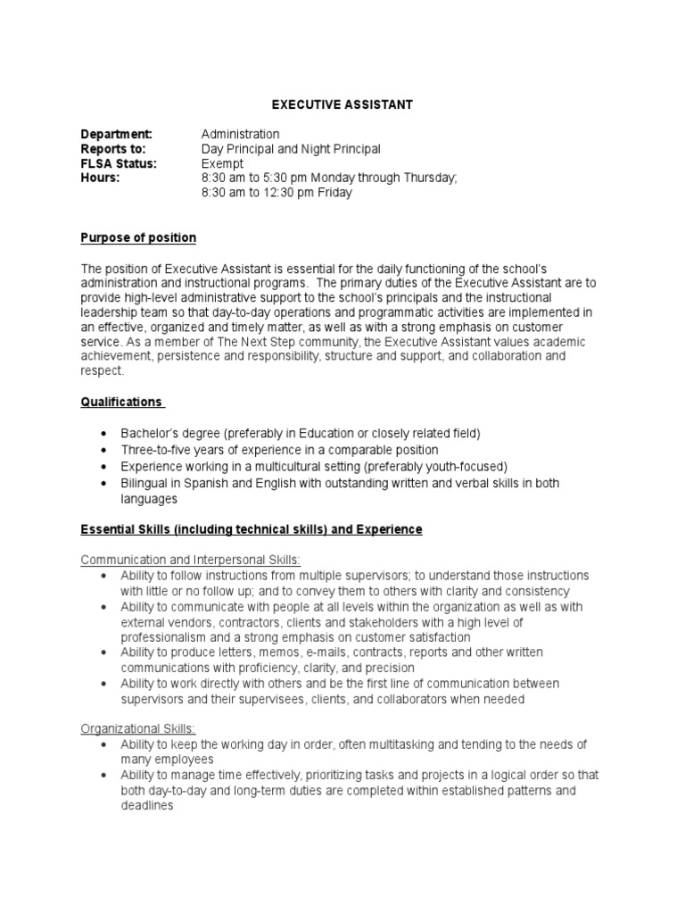 Executive Administrative Assistant Resume Sample Monster ... from dremelmicro.com Particularly as some managers promote their pa to executive assistant but are slow to fully compensate them for the greater responsibility that goes with the ea title, or give them full autonomy in the ea role. The ideal individual will have To get started, search the web for a relevant executive assistant job description sample. You will help plan their days, work with them to coordinate travel, draft emails, and possibly other duties like running errands. Acting as the point of contact among executives, employees, clients and other external partners managing information flow in a timely and accurate manner managing executives' calendars and set up meetings Executive assistant to ceo key deliverables these describe the key outcomes that are to be achieved in the role and a performance standard The personal assistant works directly with the executive assistant to the vice president in the planning, execution, and communication of their responsibilities and often handles confidential cost / expense or business related information with professionalism and integrity. Job description and person specification september 2014 page 1 of 2 job$description$ job$title:$ executive$personal.
